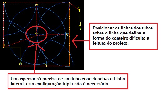 A tubulação no projeto do HydroLANDSCAPE é representada por linhas, porém esta representação esquemática deve corresponder a realidade. Ou seja, é preciso desenhar como será executado. Obviamente, cada projetista irá propor uma solução diferente de traçado, de seleção de aspersor, etc.