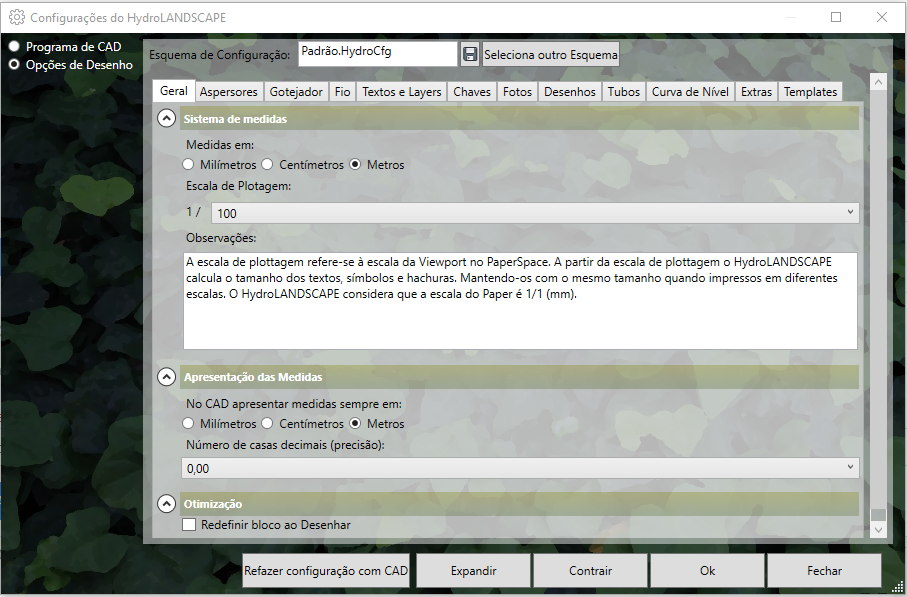 Em desenhos é possível selecionar a tolerância dos desenhos (o indicado é 10% ou 20%), o tamanho do offset e em Tamanho dos Símbolos é possível definir o tamanho dos símbolos dos aspersores, origens, válvulas e controladores.