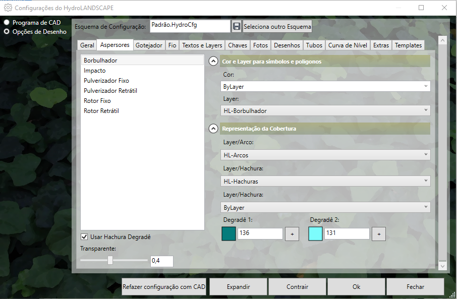 Na aba Aspersores é possível configurar como os aspersores serão desenhados pelo HydroLANDSCAPE.