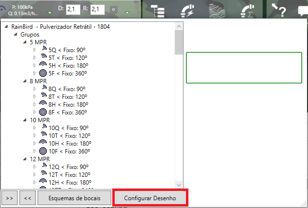 O HydroLANDSCAPE possui um símbolo pré-definido para cada item de irrigação, porém é possível configurar o desenho de cada item. Para configurar um símbolo de representação para um aspersor basta clicar no botão que lista os bocais e clicar no botão Configurar Desenho.