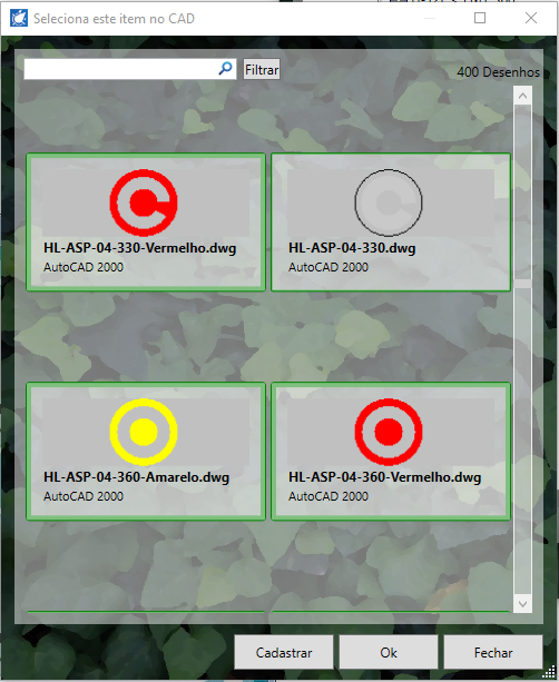 O usuário pode também cadastrar seus próprios símbolos de CAD, caso deseje. Para isso basta clicar no botão Cadastrar na tela de seleção de símbolos, selecionar o tipo de item à esquerda da tela e clicar no botão Incluir e selecionar o bloco DWG que deseja incluir no banco de dados de símbolos.