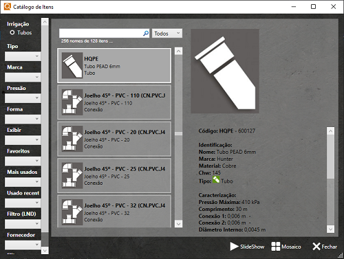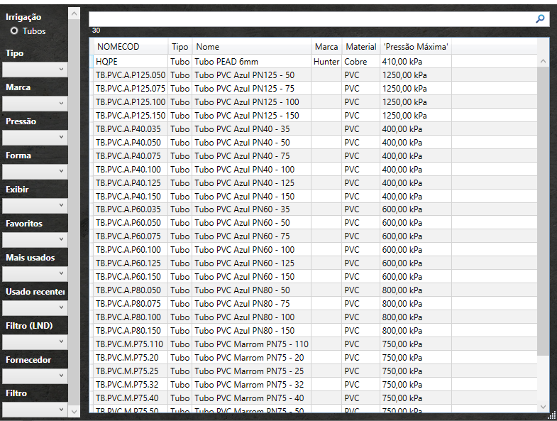 Selecionar Tubos - Esta é uma tela de busca de tubos que permite realizar buscas detalhadas através do nome do item ou filtros de seleção por marcas ou tipo. O interessante desta tela é que ela exibe as características dos tubos para facilitar na busca.