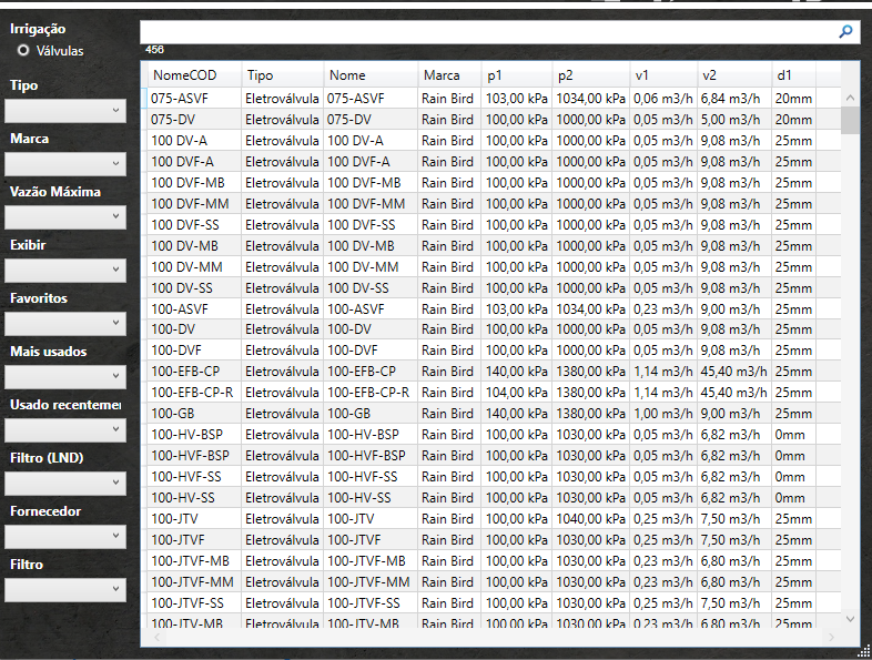 Selecionar Válvulas - Esta é uma tela de busca de válvulas que permite realizar buscas detalhadas através do nome do item ou filtros de seleção por marcas ou tipo. O interessante desta tela é que ela exibe as características das válvulas para facilitar na busca.