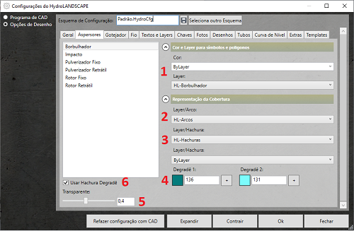 Nesta matéria veremos como configurar as opções de hachuras no HydroLANDSCAPE. Os arcos dos aspersores no HydroLANDSCAPE podem conter hachuras representando a área de cobertura de água, estas hachuras podem ser de uma cor sólida, Degrade, ou transparente.