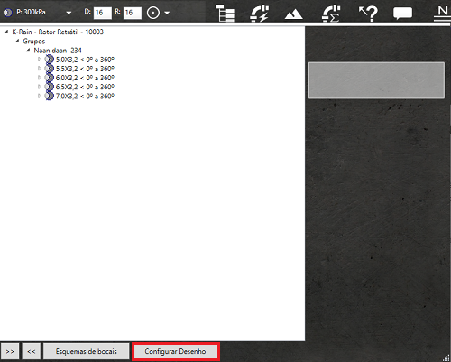O HydroLANDSCAPE possui um símbolo pré-definido para cada item de irrigação, porém é possível configurar o desenho de cada item. Para configurar um símbolo de representação para um aspersor basta clicar no botão que lista os bocais e clicar no botão Configurar Desenho.