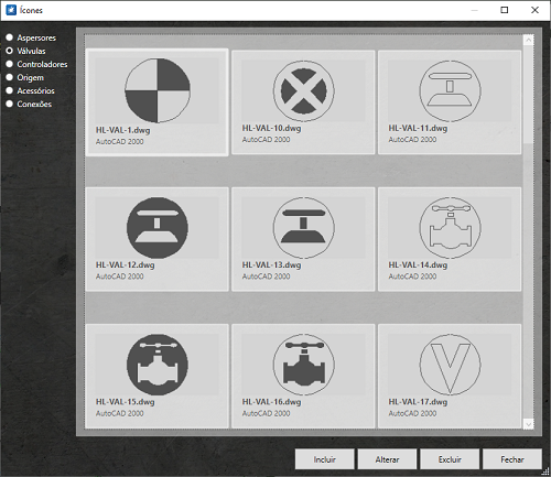O usuário pode também cadastrar seus próprios símbolos de CAD, caso deseje. Para isso basta clicar no botão Cadastrar na tela de seleção de símbolos, selecionar o tipo de item à esquerda da tela e clicar no botão Incluir e selecionar o bloco DWG que deseja incluir no banco de dados de símbolos.