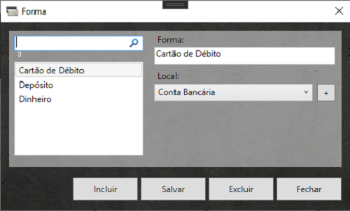 Acesso a tela de cadastro de de formas de pagamento, podem ser cadastrados dinheiro, cartão, cheque, etc.