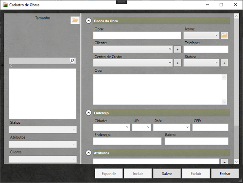 É o cadastro de obras. A obra deve pertencer a um centro de custo, e os projetos devem pertencer a uma obra. Nesta tela você deverá incluir os dados da obra, nem todos os campos da tela são obrigatórios, mas quanto mais dados preenchidos mais detalhes serão mostrados nos relatórios.