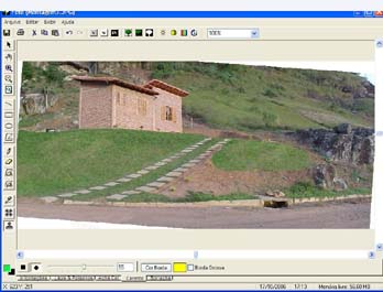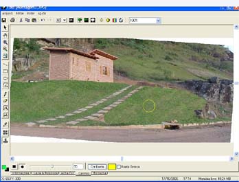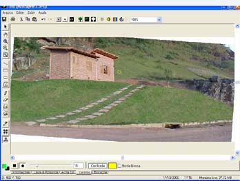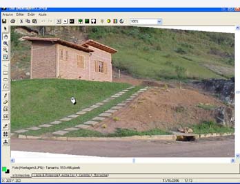 Para fazer um gramado realista em uma fotomontagem o primeiro passo é inserir a foto do terreno. Com a foto selecionada clique no menu modificar e escolha a opção Editar Imagem Raster. O programa de edição RasterEDIT será aberto. Selecione a ferramenta Carimbo e, com o botão direito do mouse, clique em uma parte da grama e, em seguida, pressione o botão esquerdo do mouse em cima da parte onde será inserido o gramado.