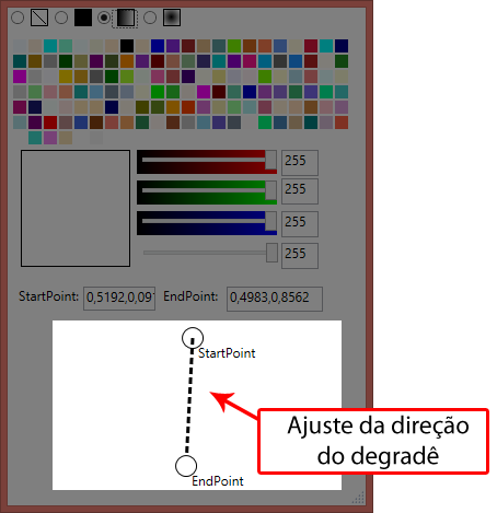 A segunda é um degradê que controlamos o ponto inicial e o ponto final das cores. Clicando nos círculos Start Point ou End Point e arrastando até um determinado ponto criamos uma direção pra a mistura.