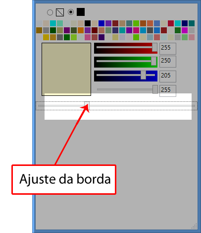 Neste local podemos criar uma borda para a seleção. Os ajustes de cores são feitos da mesma forma do preenchimento e na barra abaixo a espessura da borda. No caso da nossa fotomontagem, vamos retirar a borda clicando na primeira opção desta caixa.