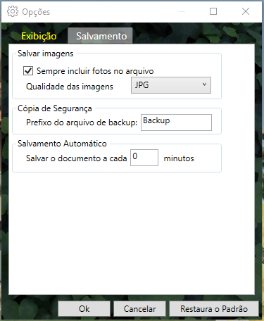Na Cópia de Segurança você pode escolher o nome do prefixo que o PhotoLANDSCAPE cria nos backups de seus arquivos. Por exemplo se seu projeto tem o nome de Jardim de Inverno, a cópia de segurança dele tem o nome de Backup_Jardim de Inverno. Alterando o prefixo, ficaria "nome escolhido"_Jardim de Inverno.