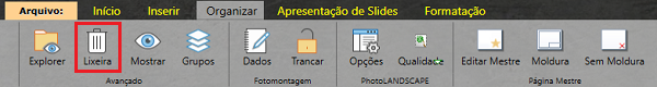 É na lixeira que ficam todos os itens que você exclui na fotomontagem, ou seja, quando você seleciona um item e clica em delete, este item não é excluído permanentemente, ele fica na lixeira podendo ser restaurado se necessário. Para restaurar itens da lixeira, acesse o ícone lixeira que fica na aba Organizar, clique sobre o item desejado e ele aparecerá novamente na tela de fotomontagem.