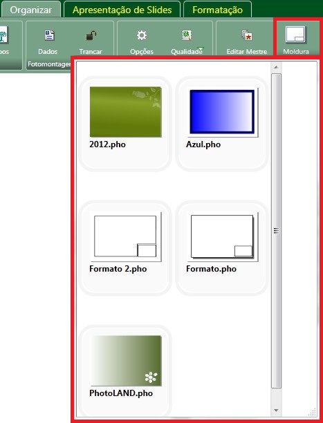 Para inserir uma moldura na fotomontagem você deve selecionar a aba Organizar e clicar na opção Moldura. Para incluir uma nova, basta ir em Arquivo, Novo e Incluir.