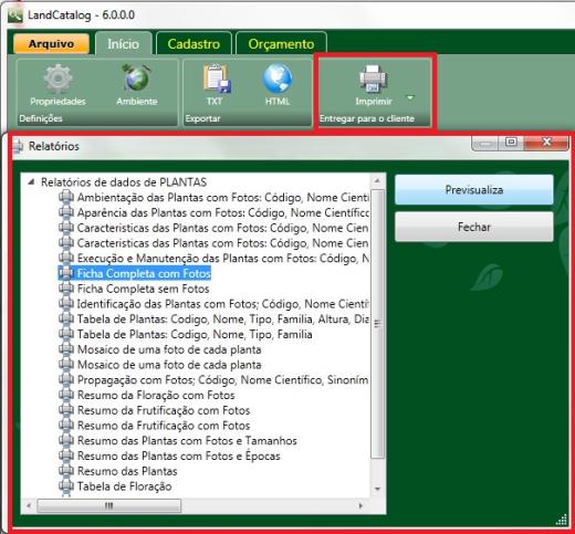 Abra o Land CATALOG e clique na opção Abrir escolhendo em seguida a opção Imprimir. Depois de selecionar a opção imprimir aparecerá uma tela com as opções de relatórios, com relatórios de orçamento e de detalhamento dos itens. Selecione o relatório que desejar e clique em imprimir.