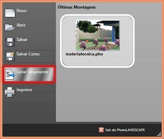 Após a execução de seu projeto realizada no PhotoLANDSCAPE, vamos iniciar a criação do relatório primeiramente clicando na aba Arquivo e ali selecionanar a opção Gerar Orçamento.
