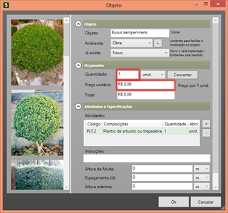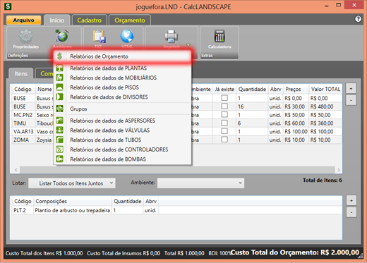 O CalcLANDSCAPE será aberto automaticamente com os itens utilizados em sua fotomontagem. O próximo passo é inserir as quantidades e os valores de cada item selecionado.
