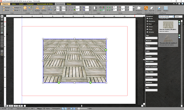 1º Passo – Com o PhotoLANDSCAPE aberto, na aba início, selecione a opção "Pisos", e escreva "deck de madeira" (ou o que preferir), o objeto escolhido será inserido.
