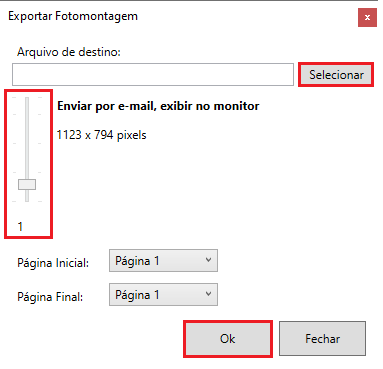 Clique no botão Exportar, escolha o local onde a imagem será salva em "Selecionar" de um nome para seu arquivo , escolha o tamanho para a imagem, o tipo de arquivo, BMP, JPEG e PNG, e clique em Ok.