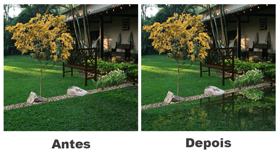 O mais interessante é que essa aplicação foi feita apenas escolhendo a opção Reflexo no menu Efeitos, sem a necessidade de duplicar os itens, rotacioná-los e diminuir sua opacidade. Note que a foto do terreno também tem suas partes refletidas.