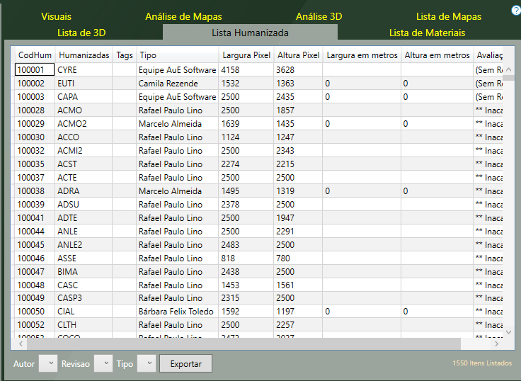 A aba Lista Humanizada apresenta uma tabela que informa os códigos das humanizadas selecionadas, as tags referentes, o autor da humanizada, as dimensões da planta sendo a altura e a largura tanto em pixels como em metros e a avaliação da humanizada.