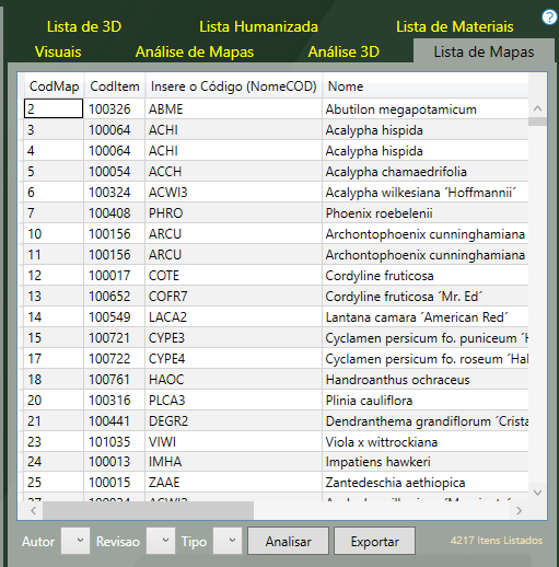 A aba Lista de Mapas mostra uma tabela com os códigos e nomes dos itens selecionados no filtro e mostra o autor responsável pela criação do mapa, as dimensões do mapa em pixels e a avaliação(classificação) do mesmo.