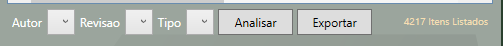 Possui filtros por Autor, Tipo e Revisão e possui os botões Exportar e Analisar.
