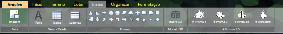 Na aba Inserir, como o nome sugere é a aba que tem opções de inserção. Esta aba possui opções de inserção de texto, tabelas, legendas, formas e 3D. A opção legenda faz a verificação de todos os itens da fotomontagem e cria uma lista de identificação numerada, utilizando a ordem de inserção.