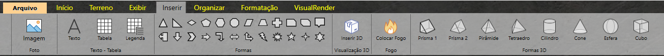 A aba inserir é responsável pelas opções de inserção. Esta aba possui opções de inserção de texto, tabelas, legendas, formas e 3D. A opção legenda faz a verificação de todos os itens da fotomontagem e cria uma lista de identificação numerada, utilizando a ordem de inserção.