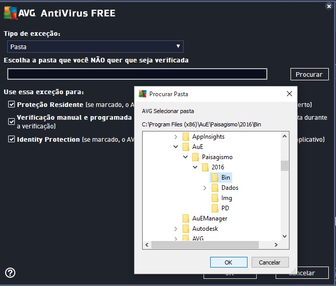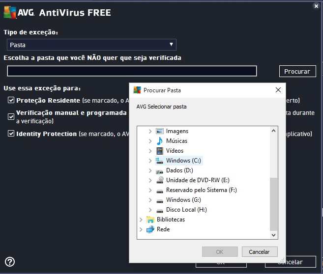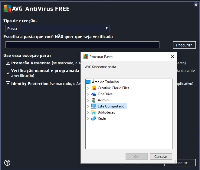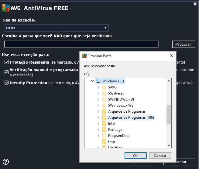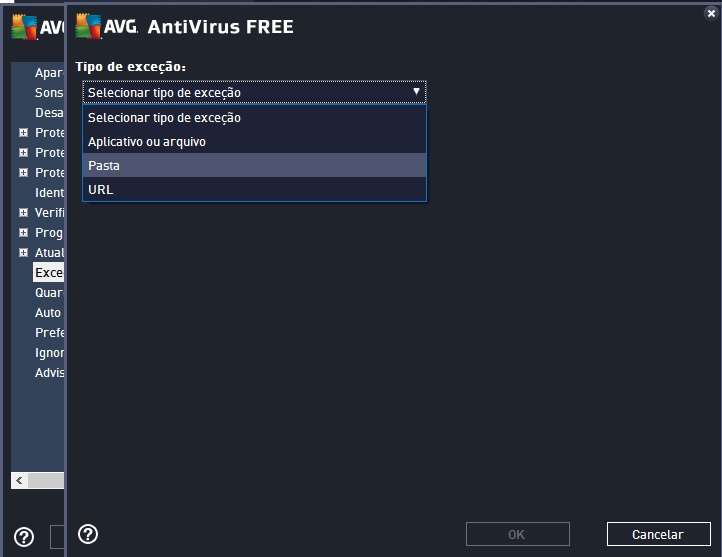 4º Passo – Na próxima janela, aparece a caixa "selecionar tipo de exceção" e escolha a opção "Pasta".