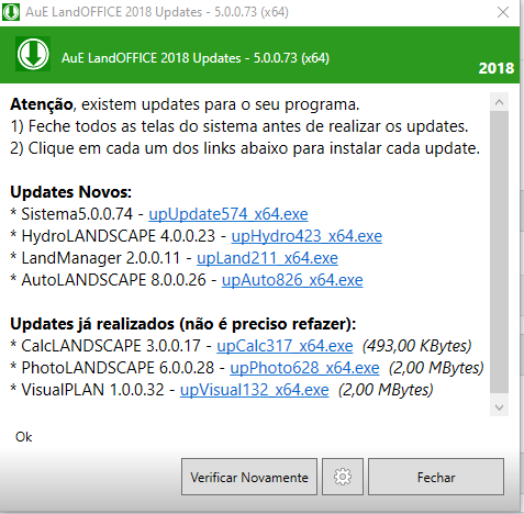 Frequentemente, a equipe de desenvolvimento da AuE Soluções trabalha na atualização dos softwares, implementando melhorias, compatibilidades e corrigindo pequenas falhas que aparecem no sistema. Ele pode ser acessado ao clicar em "Atualizar Programas pela Internet". O usuário deve manter o sistema atualizado para evitar erros e, assim, ter a certeza de estar com a última versão do software.