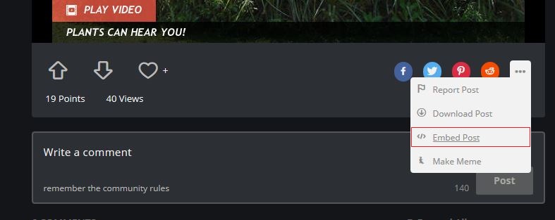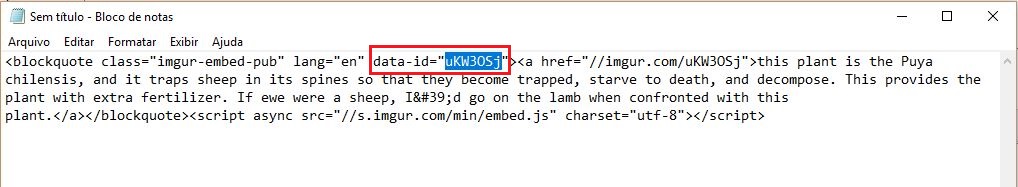 Para pegar este código basta entrar no site Imgur e escolher a imagem que desejar. Após escolher clique no ícone indicando na imagem a seguir e selecione a opção "Embed Post".
