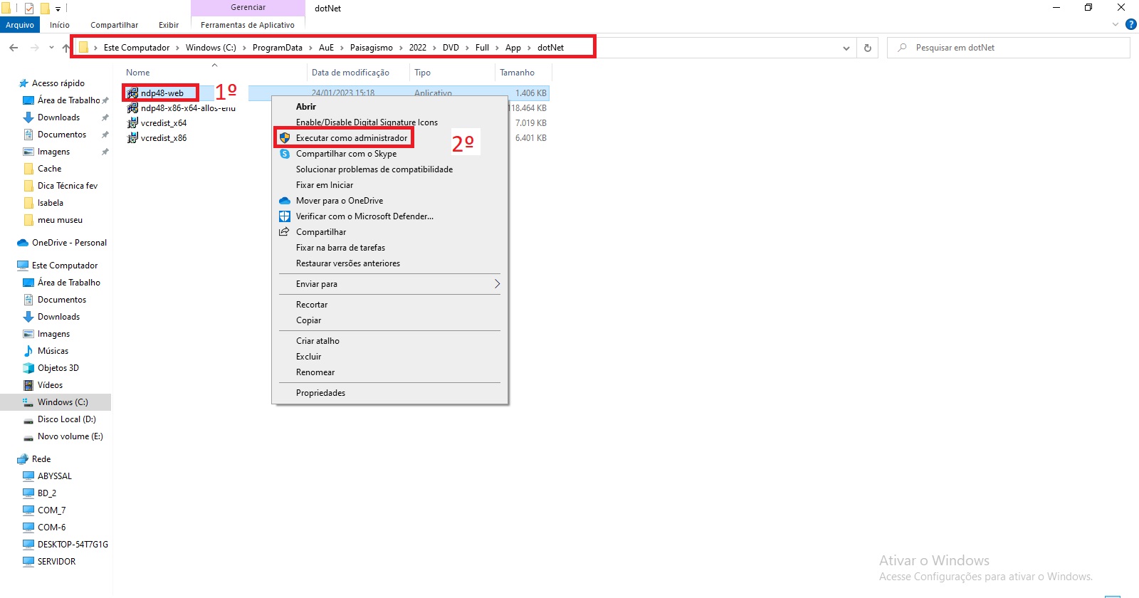 Clique sobre ndp48-web e com o botão direito do mouse, selecione a opção Executar como Administrador