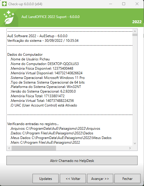 1º Passo – Abra seu AuE LandOFFICE 2022. Em Central de Suporte vá na guia Check Up.