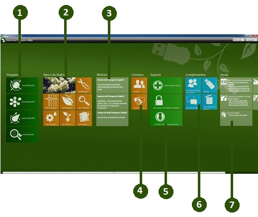 O Sistema AuE Paisagismo 2012 possui 7 categorias: Programas, Banco de Dados, Notícias, Contato, Suporte, Complementos, e ajuda.