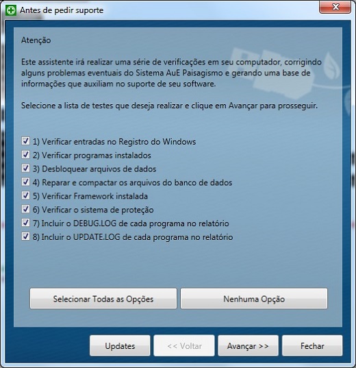 Esta opção inclui, no relatório de reparação, os arquivos de UPDATE de todos os programas instalados. Use esta opção para enviar o relatório por e-mail ao suporte da AuE Soluções.