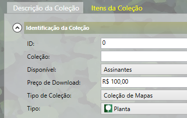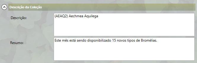 No campo "Descrição da Coleção" é preciso colocar o nome com o qual a coleção aparecerá na "AueStore", o público para o qual ela será disponibilizada, o preço do download e o tipo (nesta opção seleciona-se o ícone que será referente à sua coleção no sistema). Neste caso, criaremos uma coleção chamada "Plantas - Novembro 2019", com 15 novas plantas que estará disponível no "AuE Network" para clientes dentro do prazo de assinatura. O próximo passo é preencher o campo "Descrição", mostrando as características e sobre o que se trata a coleção criada. Em seguida devemos clicar em "Salvar" para gravar sua coleção no sistema.