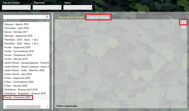 Feito isso, devemos localizar o nome da coleção criada no filtro de buscas na lateral esquerda da tela e ainda na aba "Coleção" clicar em "Itens da Coleção" para inserir os objetos que farão parte da mesma. Para incluir um novo item deve-se clicar no ícone "+". Lembrando que para publicar um objeto este deve estar cadastrado em seu banco de dados.