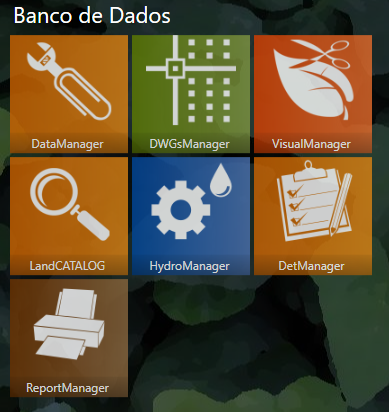Esta seção o ajudará a conhecer todas as opções disponíveis no Banco de Dados para acessar, cadastrar e visualizar. O banco de dados atual da AuE LandOFFICE 2018 contem os programas DataManager, DWGsManager, VisualManager, LandCATALOG, HydroManager, DetManager e ReportManager.