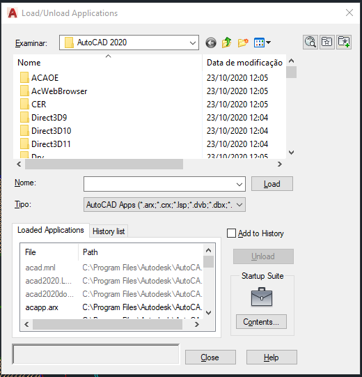 Na barra do CAD digite o comando APPLOAD e pressione a tecla enter.