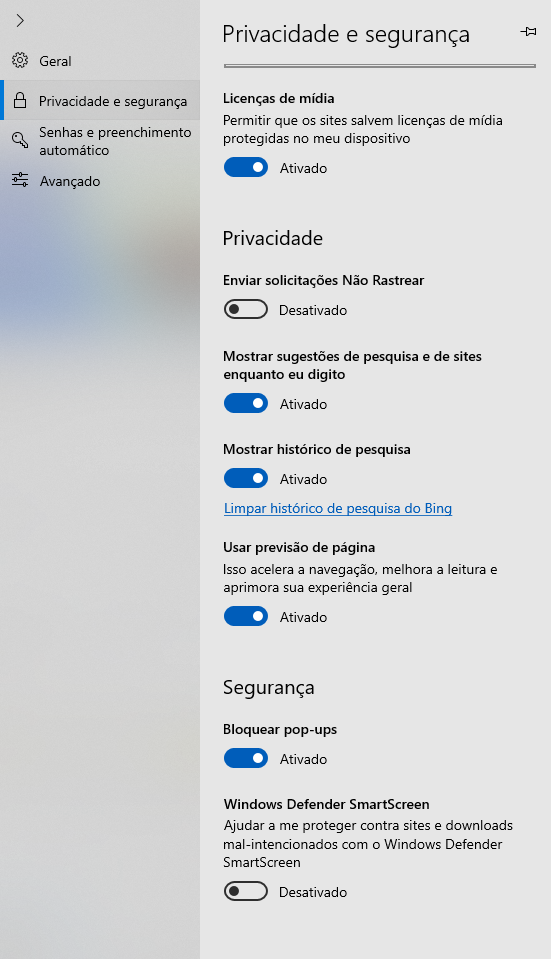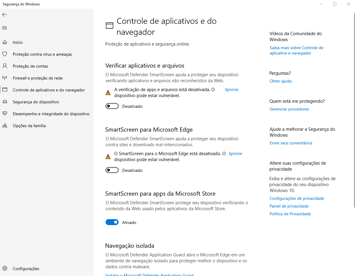4º Passo – Vá em Controle de Aplicativos do Navegador e desative as opções abaixo.