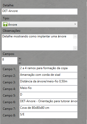 Aqui devem ser preenchidos os dados referentes ao detalhe, o campo Tipo associa o detalhe a um tipo de item, o número de campos é referente a quantidade de campos que estão descritos no desenho e os campos são os textos que serão colocados no desenho.