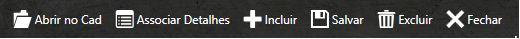 Nesta barra estão os botões de comando para Incluir, Salvar, Excluir, Abrir no CAD (para alterar o desenho), Associar Detalhes (associa os detalhes aos itens) e Fechar.