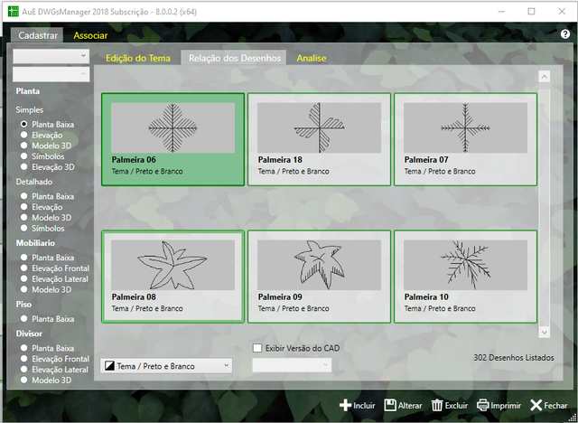 Aqui você pode selecionar o tipo de desenho de cada item (Simples, Detalhado, Mobiliário, Piso, Divisor e Símbolos). Somente plantas possuem categorias de desenhos Simples e Detalhado.