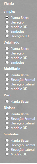 Aqui você pode selecionar o tipo de desenho de cada item (Simples, Detalhado, Mobiliário, Piso, Divisor e Símbolos). Somente plantas possuem categorias de desenhos Simples e Detalhado.