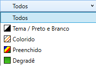 Aqui você seleciona o categoria de desenhos que será listada, são cinco opções: Tema (desenhos preto e branco), Colorido, Preenchido, Degrade e Todos (lista todos os tipos de desenhos).