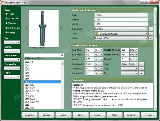 O HydroManager é o sistema de gerenciamento do Banco de Dados de irrigação do Sistema AuE Paisagismo. O HydroManager traz todas as informações e controle sobre o cadastro de Itens (Tubos, Aspersores, Válvulas, Controladores e Bombas), permitindo a inclusão, alteração e exclusão dos mesmos.