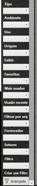 Você pode selecionar o tipo de item, fazer filtros pré-definidos ou criar seus próprios filtros.
