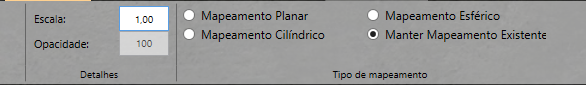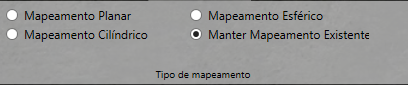 Essa função apresenta as opções do tipo de mapeamento, que são: Planar, Cilíndrico, Esférico ou manter o mapeamento já existente.