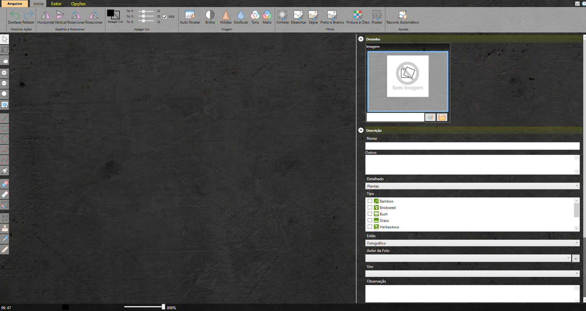 A Barra de ferramentas possui funções comuns a barra do VisualPLAN, como a inclusão de linhas e formas porém, possui funções diferentes como as borrachas, o carimbo , o recorte de figura e o conta gotas.